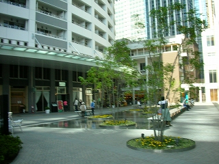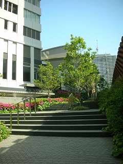 空地に設置した水盤を取り囲むように中高木を配置し、行き交う人々にも癒しの空間を提供。